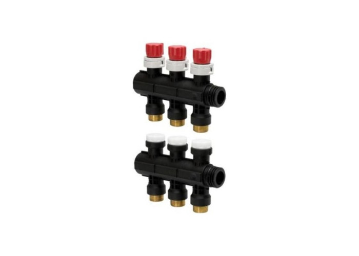 Коллектор Uponor Vario Plus 1030583 на 3 выхода, 1030584 на 4 выхода, 1030585 на 5 выходов. Коллектор серии Vario Plus оснащен регулируемыми расходомерами со шкалой от 0 до 4 л/мин для балансировки расхода в петлях. Используется с коллекторным комплектом арт. 1009209. Подключение правое или левое с торцевым уплотнением, либо снизу с использованием углового соединения арт. 1032702. Выходы на петли имеет наружную резьбу 3/4" НР Евроконус, совместим с резьбовыми адаптерами Uponor 3/4" ВР Евроконус. Особенности: расстояние между выходами 50 мм; возможность полного закрытия петли; ручная регулировка; максимальная рабочая температура +60°C; максимальное рабочее давление 6 бар. Цвет: черный.