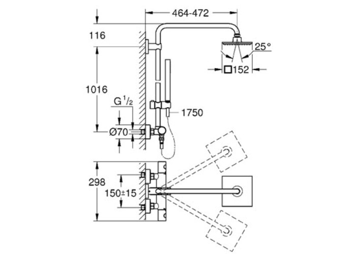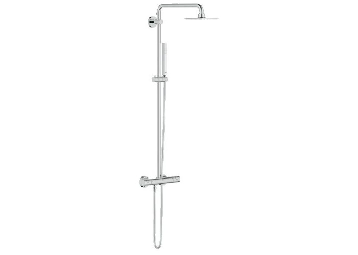Душевая системавключает в себя: душевой кронштейн, вынос 450 мм, настенный термостат с аквадиммером, выбор между: Верхний душ, душевая струя Rain, с шаровым шарниром, угол поворота ± 12°, ручной душ, регулируется по высоте с помощью скользящего элемента, душевой шланг 1750 мм, минимальный расход воды 7л/мин, ограничитель расхода воды 9,5 л/мин, хром, встроенный термоэлемент, с системой SpeedClean против известковых отложений, внутренний охлаждающий канал для продолжительного срока службы, совместим с проточным водонагревателем от 18 kВ/ч; минимальное давление 1 бар