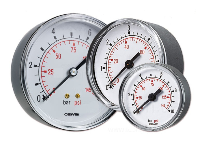 1) Манометри вертикальні і фронтальні: ∅40, ∅50, ∅63, ∅80, ∅100 з радіальним/заднім підключенням призначені для вимірювання тиску рідких та газоподібних рідин, які не є надто в'язкими, застиглими або корозійними для сплавів з міді та олова. Протиударний корпус із пластика (RP) або сталі (RM). Небитке скло з метакрилату. З'єднання - латунь. Чутливий елемент - трубка Бурдона з мідного сплаву. Подвійна шкала Bar/PSI. Клас точності 2,5.