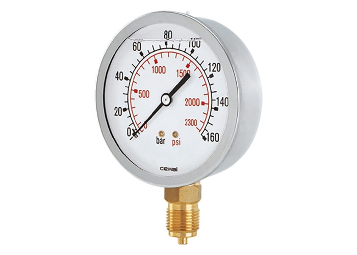 4) Манометри гліцеринові ∅63, ∅100 для вимірювання тиску в умовах підвищеної вібрації. Вони мають сталевий (AISI 304) герметичний корпус, полікарбонатні скло. Манометр заповнений гліцерином подвійного очищення для гасіння вібрацій, перепадів тиску і ударів. Вимірювальний елемент - трубка Бурдона з мідного сплаву. Клас точності 1 - 1,6 - 2,5 відповідно до стандарту UNI EN 837-1.