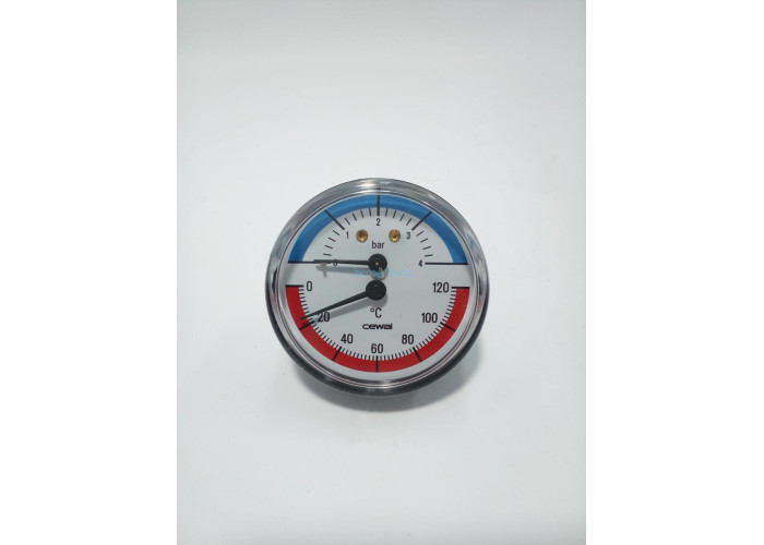 А Вертикальні/ фронтальні термоманометри ∅63, ∅80, 0 ÷ 120 ° С, нижнє/заднє підключення. Призначені для вимірювання тиску і температури рідких і газоподібних середовищ в опалювальних системах, котлах та інших приладах. Корпус з ударостійкого пластику, скло з метакрилу, підключається до системи через латунний фітинг 1/2 ". Шкала нанесена на алюмінієву основу невигоряючою фарбою і покрита захисним шаром лаку. Шкала тиску від 0 до 4 або 6 бар (в залежності від модифікації). Механізм манометра являє собою рухливу пружину Бурдона з компенсуючою біметалічною спіраллю для підвищення точності показань. Термоманометр оснащений клапаном, що відкривається.
