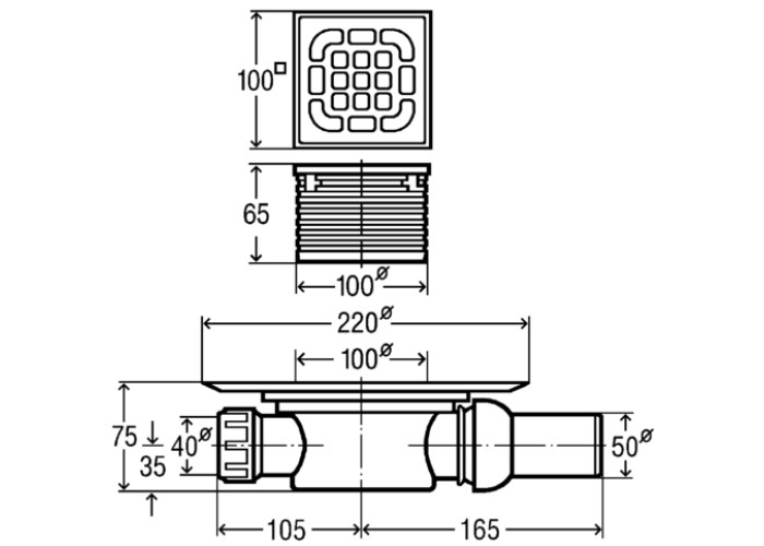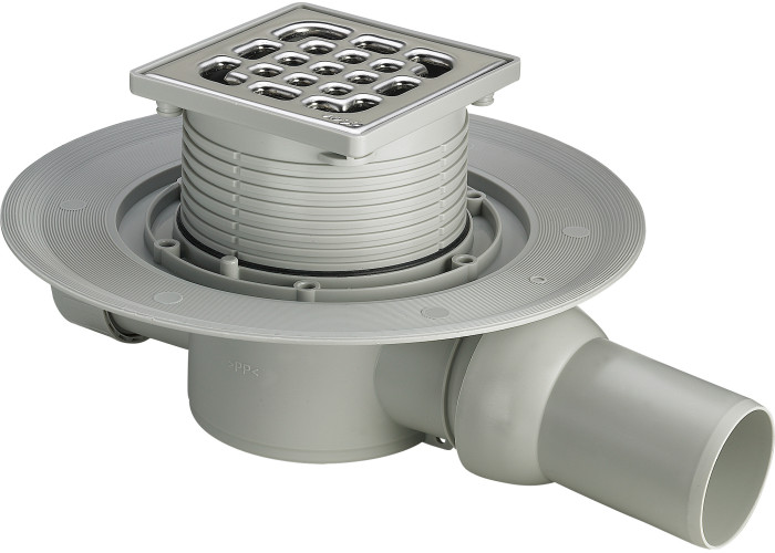 Трап для ванной комнаты, высота столба жидкости в гидрозатворе 30 мм, класс нагрузки K=300 кг, в комплектацию входит : поворотная и регулируемая по высоте насадка 100x100 мм, рамка для установки решетки сделана из пластика, заглушка, штампованная решетка из нержавеющей стали 1.4301, фланец для нанесения/закрепления гидроизоляции, съемное устройство для защиты от неприятного запаха из системы канализации, ввод для подключения дополнительных сантехприборов DN40, выпуск на шарнирном соединении