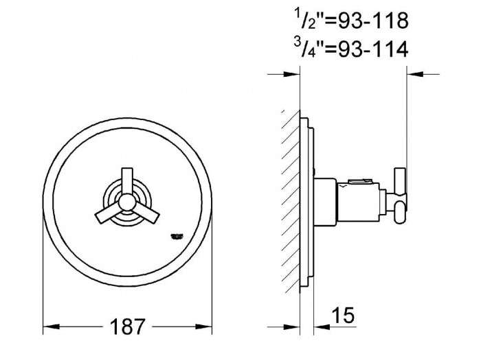 Центральный термостат с рукояткой. Рукоятка выбора температуры со стопором при 38°C.