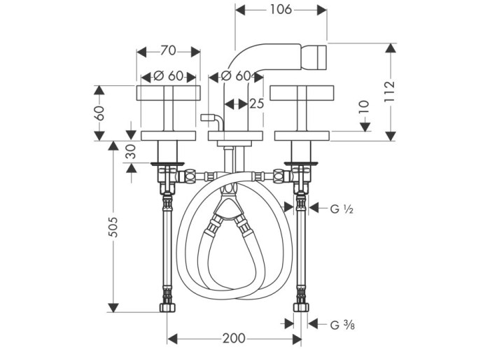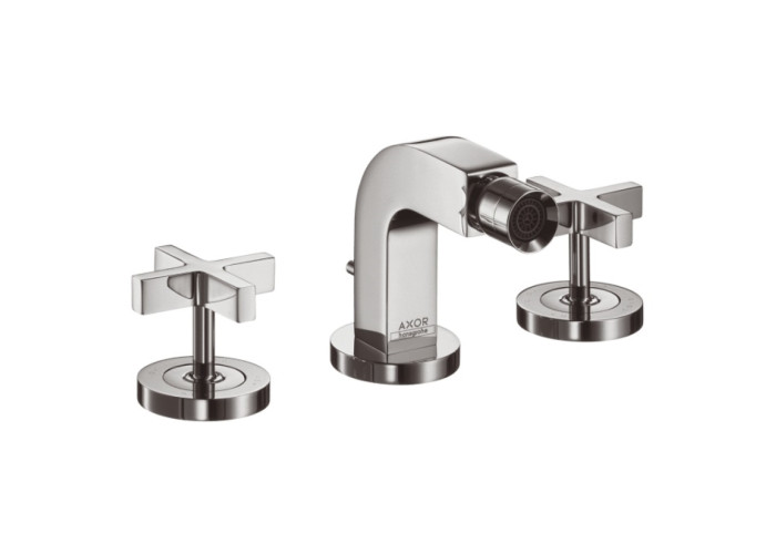 Смеситель для биде на три отверстия, с крестовыми рукоятками, поверхность - хром, аэратор с шарнирным соединением, с отдельными розетками, вентили Elastop, расход воды 7 л/мин, донный клапан, подходит для работы с проточным водонагревателем, со шлангами подводки