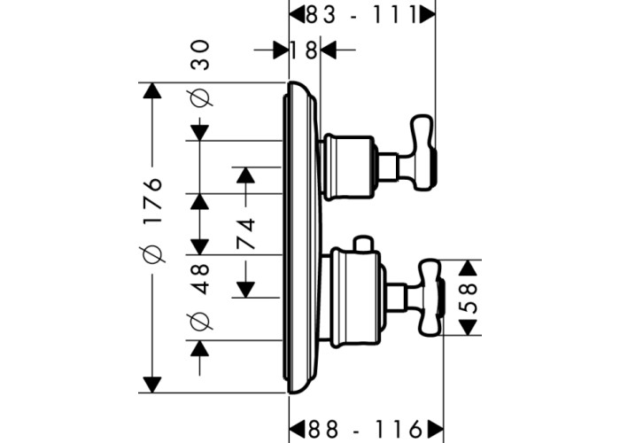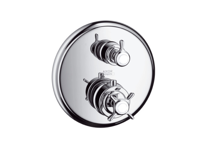 Axor Montreux Термостат с запорным /переключающим вентилем, шлифованный никельПредохранительный стопор при 38°C, расход воды: 26 л/мин