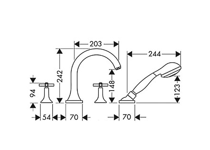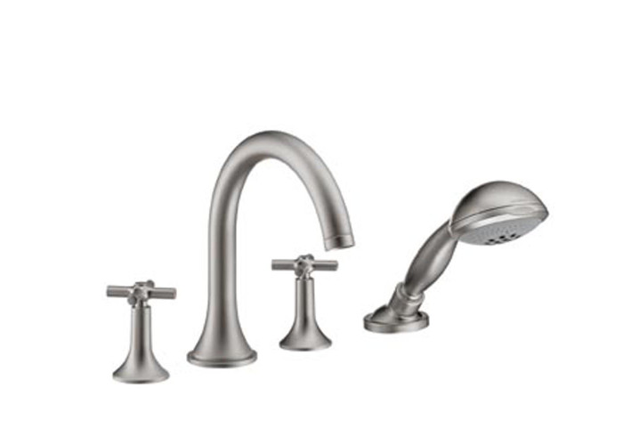 Смеситель на край ванны на 4 отверстия, двухрычажный, врезной в ванну. Наружная часть: рукоятки, излив на ванну, ручной душ, вентили Elastop, защита от обратного тока воды. Максимальное вытяжение шланга 1,10 м. Цвет - сатин