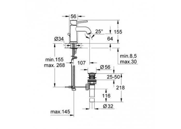 Смеситель для раковины, однорычажныйкерамический картридж, монтаж на одно отверстие, аэратор, гибкие подводы G 3/8, длина подводки 268 мм, донный клапан G 1 1/4, хром