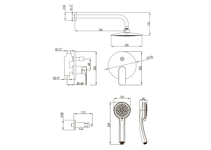 BILINA комплект для ванны/душа (смеситель с переключ., верхн.душ, ручной душ, шланг, шланг. подсоед)