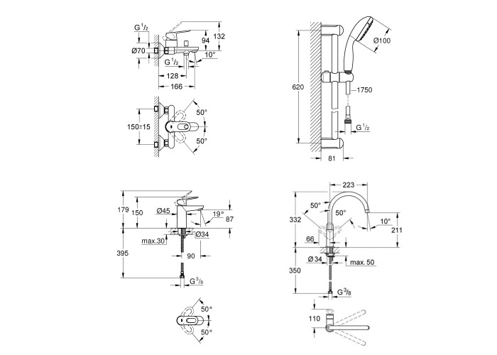 Длина шланга, мм Гигиенический душ: 1500. Ручной душ: 1750