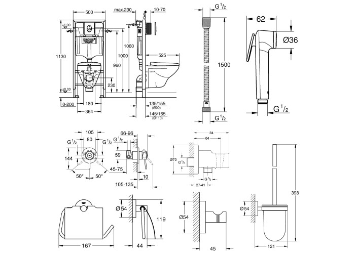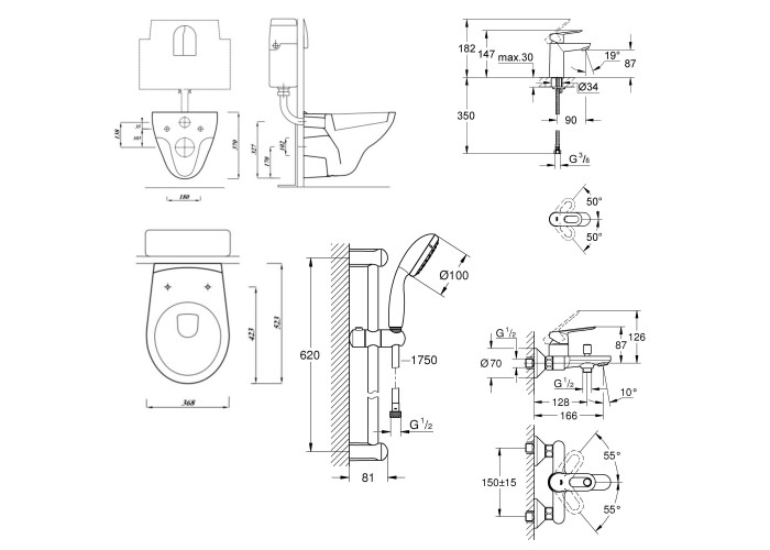 Унітаз; сидіння; інсталяція; панель змиву; змішувач вбудований (29048000); лійка для гігієнічного душу (27512001); шлангове під‘єднання (28628000); душовий шланг (28105000); змішувач для ванни (32815000); змішувач для раковини (23337000); душовий гарнітур (27598000): лійка для ручного душу, душовий шланг, кронштейн для ручного душу, душова стійка; гнучка підводка; гачок для одягу (40364001); тримач туалетного паперу (40367001); йоржик для унітазу (40374001); кріплення.