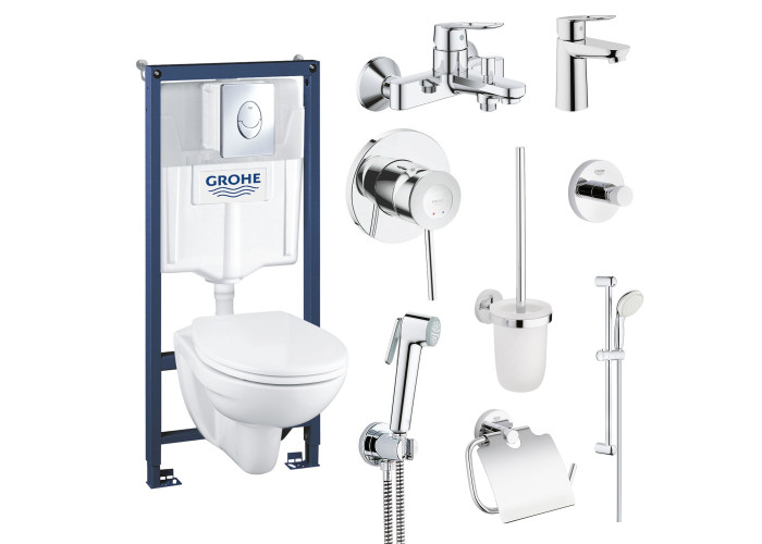 Великий набір для будинку Grohe Mega Bundle 39400MB1 - це комплексне рішення облаштування санвузла. Завдяки такому набору тепер не потрібно купувати усі необхідні предмети сантехніки окремо. До комплектації входить інсталяція з унітазом Grohe Solido Compact комплект 4 в 1 39400000, набір для гігієнічного душу зі змішувачем Grohe BauClassic 111048, набір змішувачів Grohe BauLoop S-Size 123214S і набір аксесуарів Grohe Essentials 40407001.