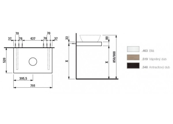 CASE столешница 791*80*520 мм, повесная, с вырезом посредине, в комплекте 2 кронштейна, цвет - светлый дуб.