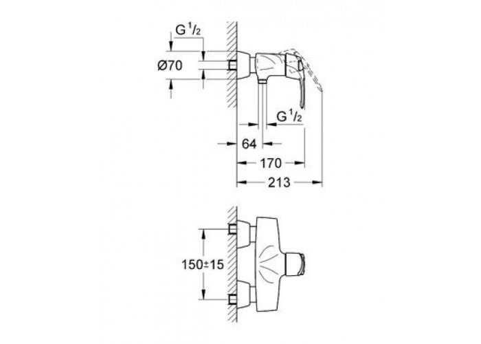 Керамический картридж Ø 46 мм регулировка расхода воды, отвод для душа снизу 1/2, встроенный обратный клапан в душевом отводе 1/2, скрытые S-образные эксцентрики с защитой от обратного потока, дополнительный ограничитель температуры, хромированная поверхность