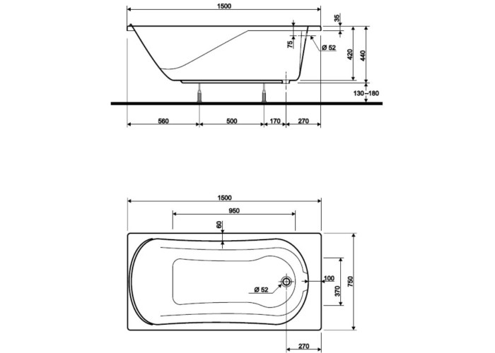 Ванна акриловая Коло-Дымер с ножками. Длина 150 см, ширина 75 см, высота 44 см. Для пристенного монтажа