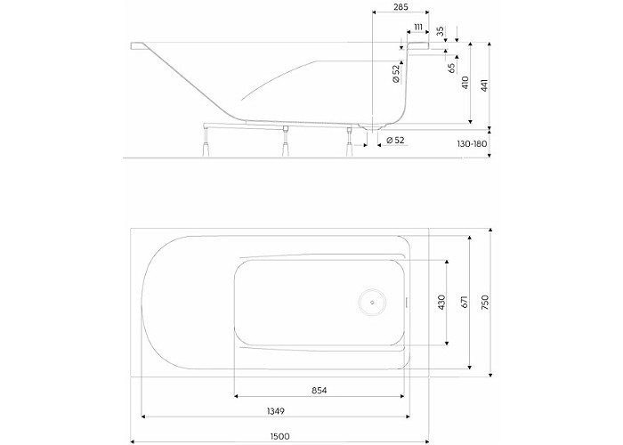 Ванна акриловая Коло-Дымер, с ножками. Длина 160 см, ширина 75 см, высота 44 см. Для пристенного монтажа