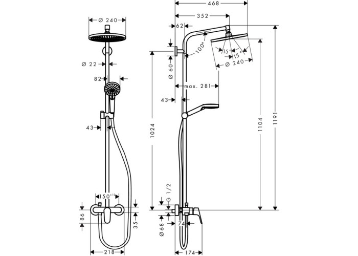 Регулируемый ограничитель температуры горячей воды; верхний душ Crometta S 240; размер душевого диска: 240 мм; регулируемый угол верхнего душа; тип струи: Rain; расход воды для струи Rain (при 3 бар): 15 л / мин; полностью хромированный душевой диск; длина держателя для душа: 350 мм; регулируемое по высоте крепление ручного душа; вид монтажа: наружный монтаж; величина соединения DN15; соединительная резьба G ½; межосевое подключение 150 мм ± 12 мм; керамический узел смешивания; регулируемое ограничение температуры; класс шума: I; класс расхода воды: O, B.