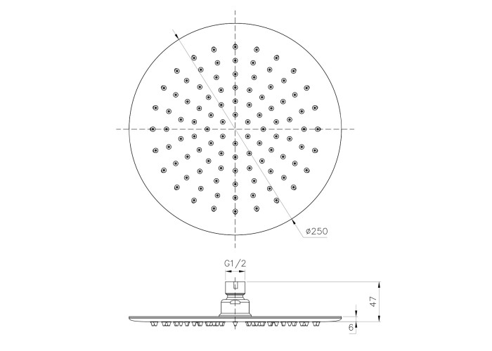Верхний душ диаметром 250 мм, сталь, толщина 6 мм, один тип струи, без держателя, цвет хром.