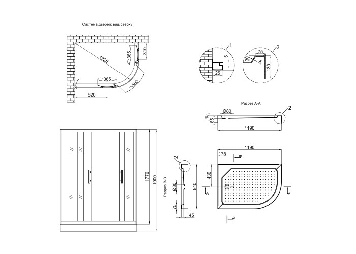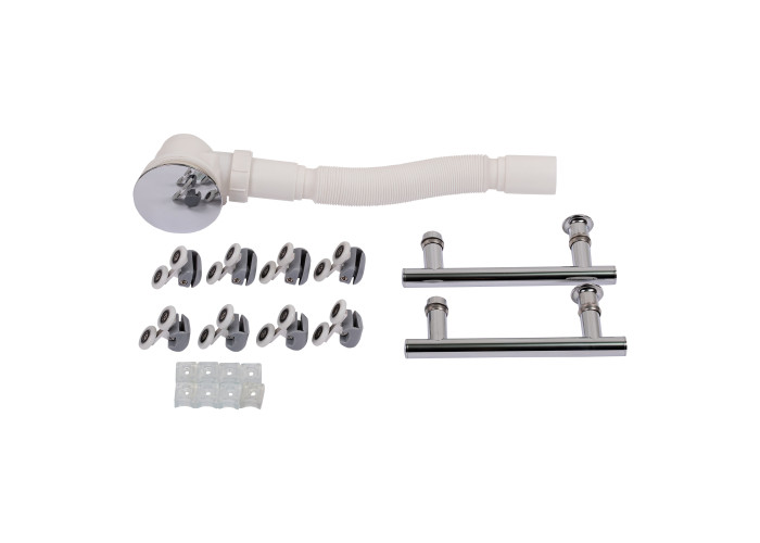 Поддон, сифон, профиль, двойные ролики, крепежи, глухое стекло, стеклянные двери, ручки, соединяющий элемент.
