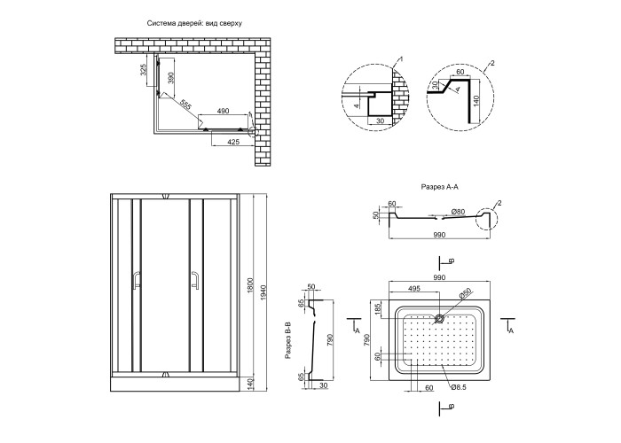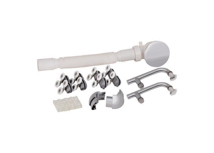 Поддон, сифон, переходник 32/50 мм, профиль, двойные ролики, крепежи, глухое стекло, стеклянные двери, ручки, соединяющий элемент.