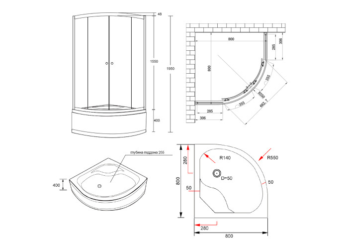 Поддон, сифон, переходник 32/50 мм, профиль, двойные ролики, крепежи, глухое стекло, стеклянные двери, ручки.