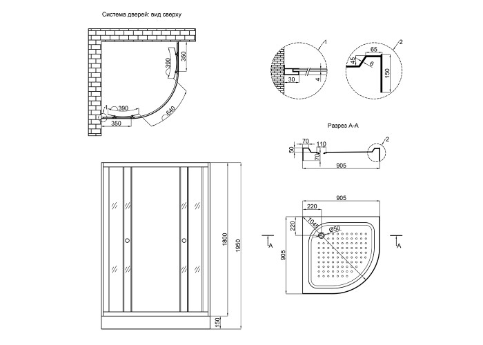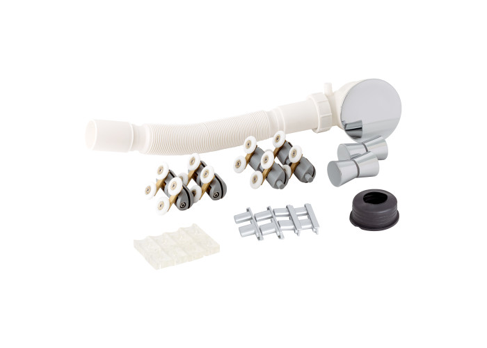 Поддон, сифон, переходник 32/50 мм, профиль, двойные ролики, крепежи, глухое стекло, стеклянные двери, ручки.