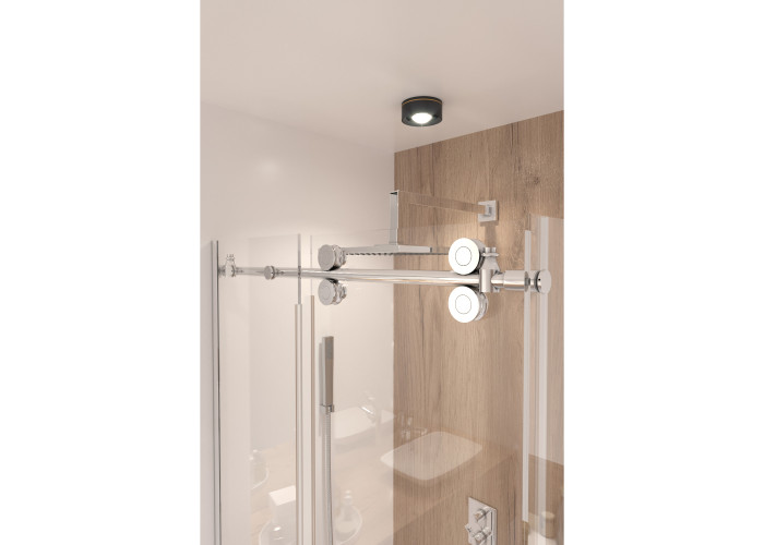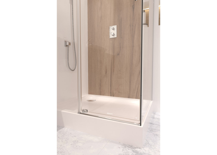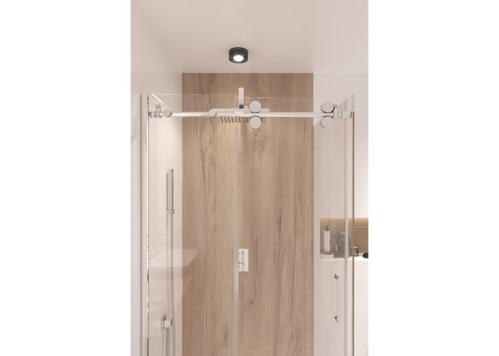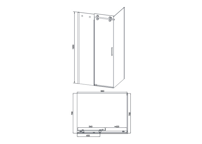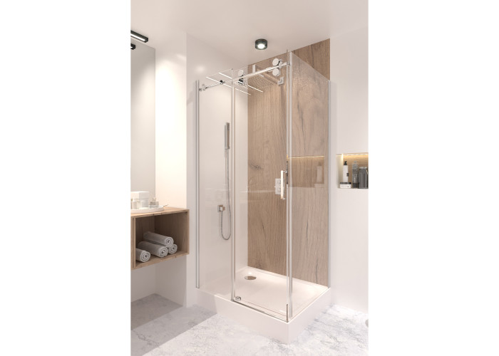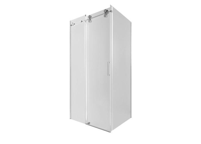 Верхній профіль, металеві ролики, бічна панель, глухе скло, скляні двері, нижній борт, комплект кріплень, ручка, набір ущільнювачів, заглушки.
