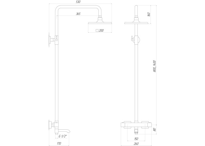 - верхний душ - квадратная лейка 20 см, стойка ( 80-140 см )