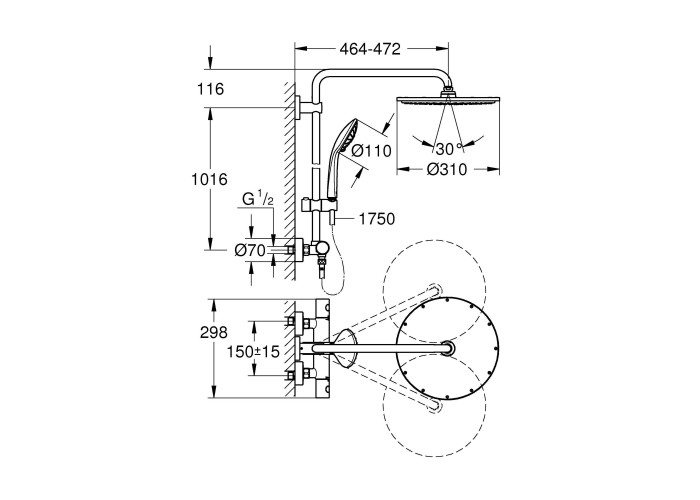 Горизонтальний поворотний душовий кронштейн, душова штанга, настінний термостат з аквадиммером, лійка для ручного душу Euphoria 110 Massage (27221), лійка для верхнього душу Rainshower Cosmopolitan 310 (27477), душовий шланг (28388A00), ковзний тримач для душа.