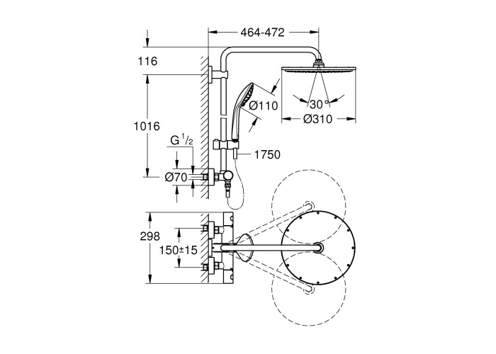 Горизонтальний поворотний душовий кронштейн, душова штанга, настінний термостат з аквадиммером, лійка для ручного душу Euphoria 110 Massage (27221), лійка для верхнього душу Rainshower Cosmopolitan 310 (27477), душовий шланг.