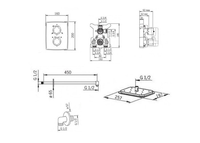 Змішувач, кронштейн для ручного душу, лійка для ручного душу, кронштейн для верхнього душу, лійка для верхнього душу, кріплення.