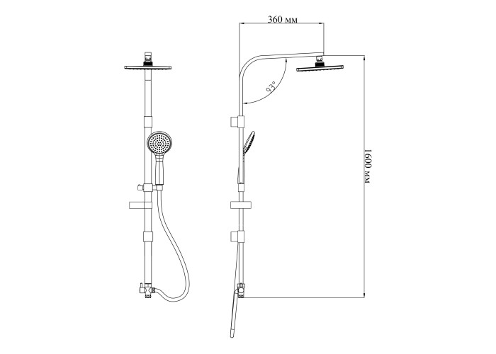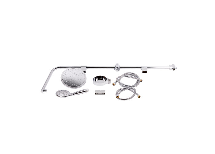 Кронштейн для верхнього душу, лійка для верхнього душу, кронштейн для ручного душу, лійка для ручного душу, душовий шланг, душова стійка, мильниця, кріпильні деталі.