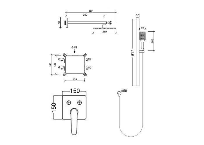 Змішувач, кронштейн для верхнього душу, лійка для верхнього душу, кронштейн для ручного душу, шлангове приєднання, лійка для ручного душу, душовий шланг, кріпильні деталі.