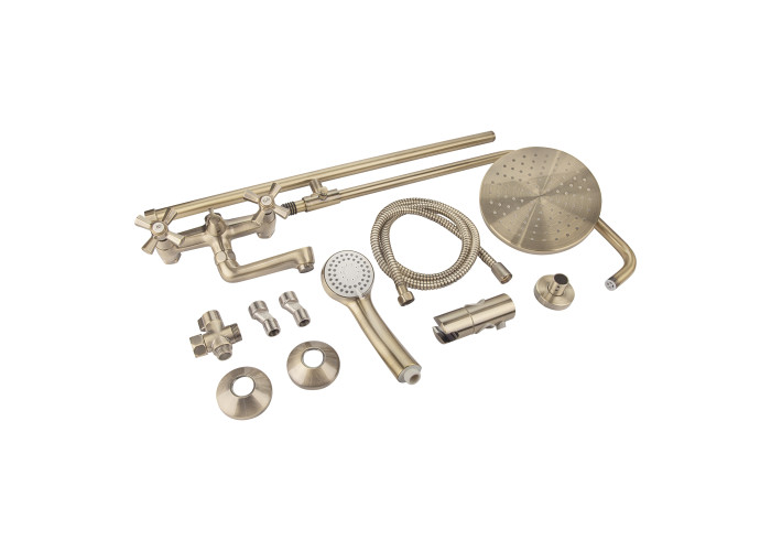 Смеситель, кронштейн для верхнего душа, лейка для верхнего душа, кронштейн для ручного душа, лейка для ручного душа, душевой шланг, душевая стойка, крепежи.