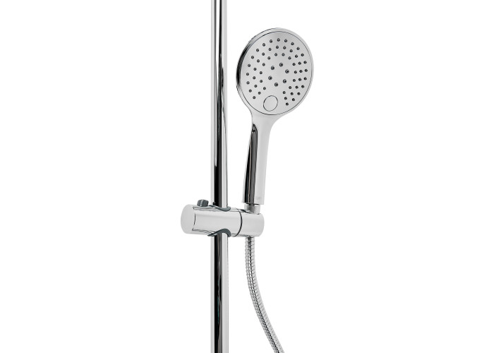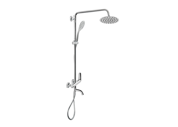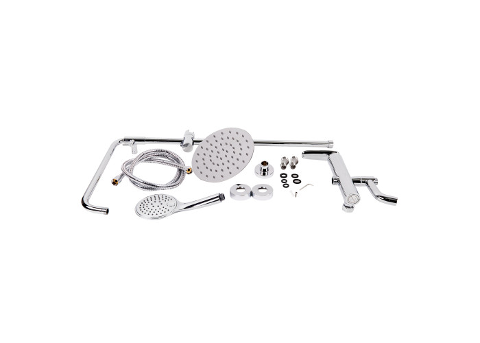 Комплектация Смеситель, кронштейн для верхнего душа, лейка для верхнего душа, кронштейн для ручного душа, лейка для ручного душа, душевой шланг, душевая стойка, крепежи.