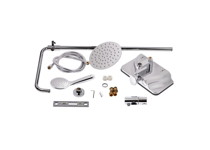 Смеситель, кронштейн для верхнего душа, лейка для верхнего душа, кронштейн для ручного душа, лейка для ручного душа, душевой шланг, душевая стойка, уровень, крепежи.
