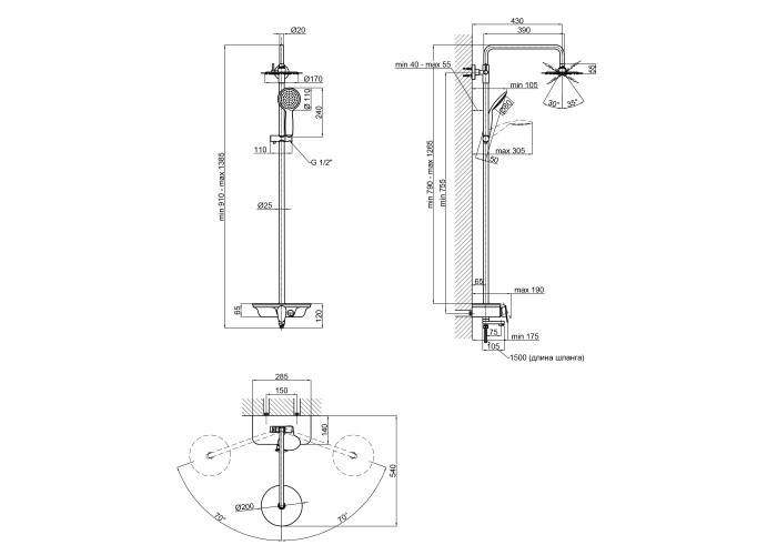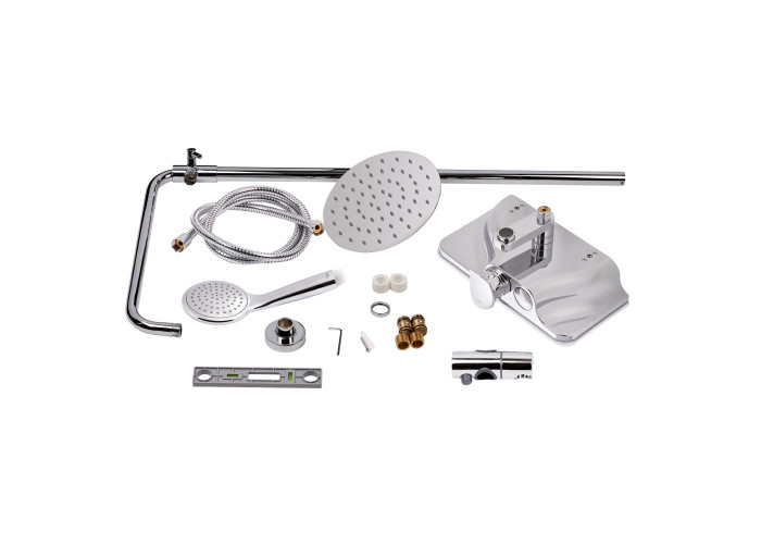 Смеситель, кронштейн для верхнего душа, лейка для верхнего душа, кронштейн для ручного душа, лейка для ручного душа, душевой шланг, душевая стойка, уровень, крепежи.