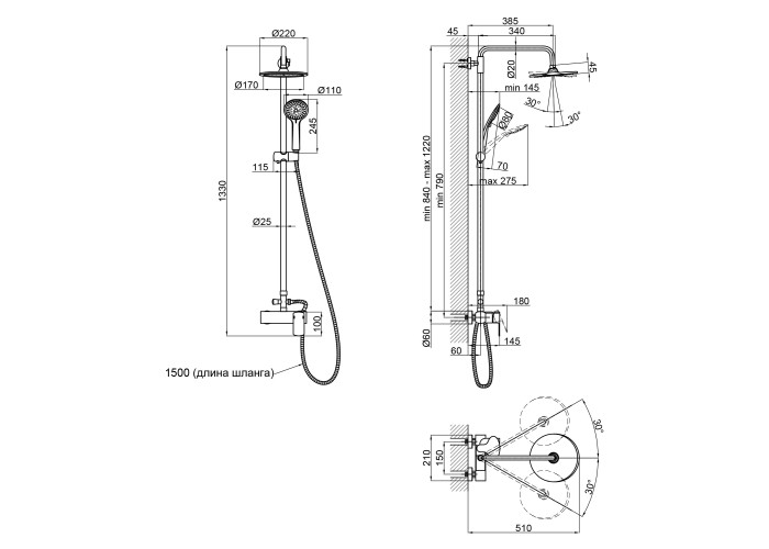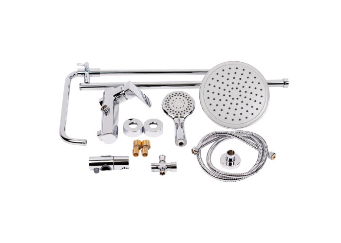 Смеситель, кронштейн для верхнего душа, лейка для верхнего душа, кронштейн для ручного душа, лейка для ручного душа, душевой шланг, душевая стойка, крепежи.