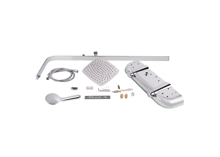 Смеситель, кронштейн для верхнего душа, лейка для верхнего душа, кронштейн для ручного душа, лейка для ручного душа, душевой шланг, душевая стойка, уровень, крепежи.