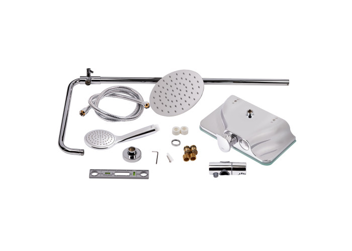 Смеситель, кронштейн для верхнего душа, лейка для верхнего душа, кронштейн для ручного душа, лейка для ручного душа, душевой шланг, душевая стойка, крепежи.