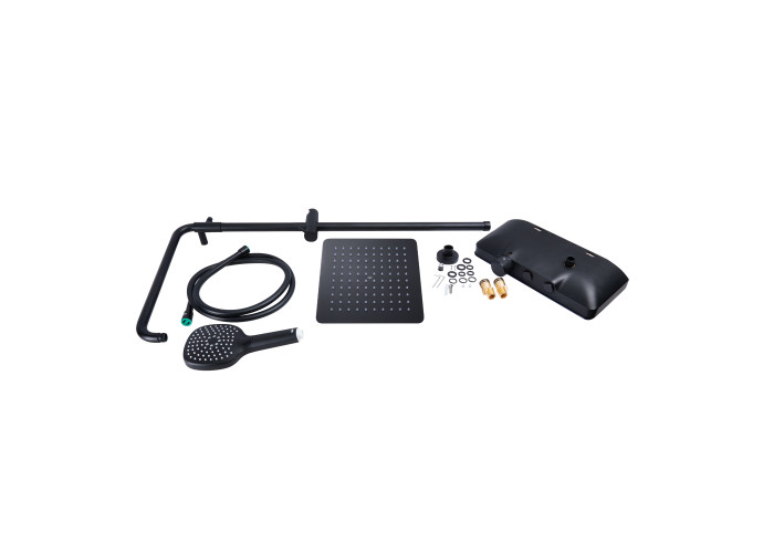 Змішувач, кронштейн для верхнього душу, лійка для верхнього душу, кронштейн для ручного душу, лійка для ручного душу, душовий шланг, душова стійка, рівень, кріпильні деталі.