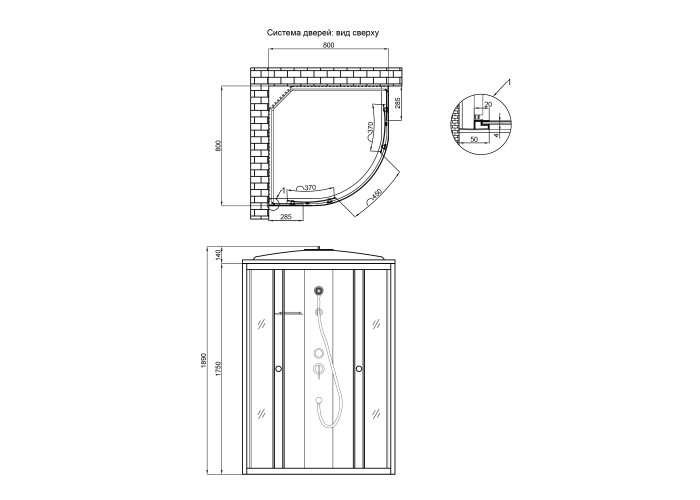 Ручки, подвійні ролики, профіль, комплект кріпильних деталей, задня стінка, глухе скло, скляні двері, душова панель, змішувач, лійка для ручного душа, лійка для верхнього душа, душовий шланг, кронштейн, верхня кришка, скляна полиця.