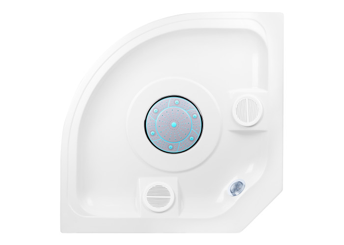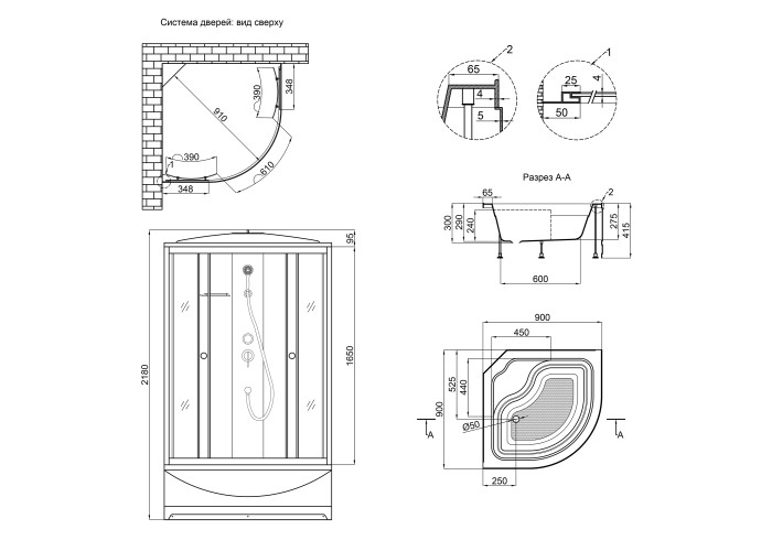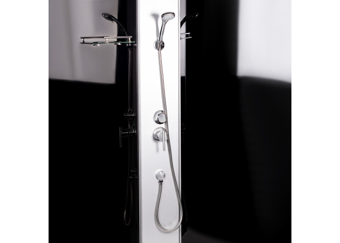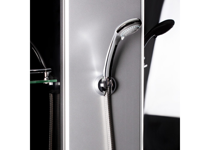 Поддон, сифон, двери, ручки, ролики, профиль, крепежи, задняя стенка, панель, смеситель, лейка для ручного душа, лейка для верхнего душа, душевой шланг, кронштейн для ручного душа, ножки, верхняя крышка, стеклянная полка, переходник 32/50 мм.