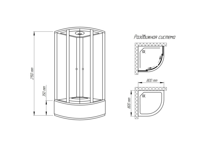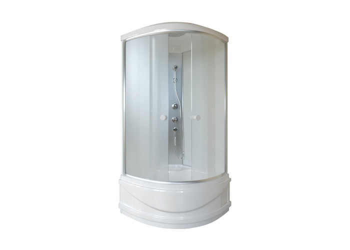 Поддон, сифон, дверцы, ручки, ролики, профиль, крепежи, задняя стенка, панель, смеситель, лейка для ручного душа, лейка для верхнего душа, душевой шланг, кронштейн, ножки.