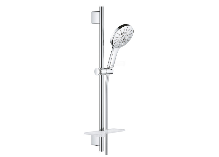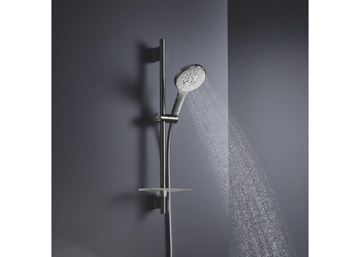 Душовий гарнітур Grohe Rainshower Smartactive 130 26546000 - функціональний, зручний і надійний душовою атрибут. Він складається з штанги, що ковзає по стійці, кронштейна, лійки для ручного душу з 3 режимами перемикання, душового шланга і полички. Якісне хромоване покриття додає привабливий зовнішній вигляд і продовжить експлуатаційний термін виробу.