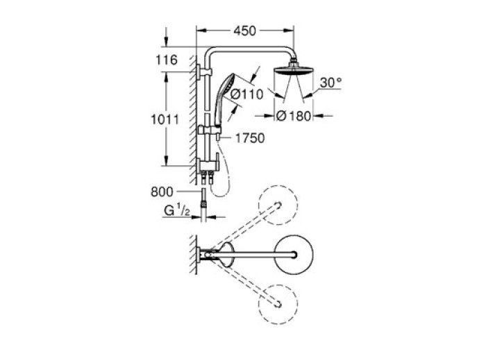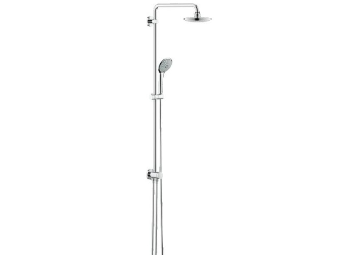 Душевая система, включает в себя: душевой кронштейн, вынос 450 мм, переключатель с верхнего на ручной душ, выбор между: Верхний душ, душевая струя Rain, с шаровым шарниром, угол поворота ± 15°, ручной душ, регулируется по высоте с помощью скользящего элемента, душевой шланг 1750 мм, минимальный расход воды 7л/мин, хром, с системой SpeedClean против известковых отложений, внутренний охлаждающий канал для продолжительного срока службы, совместим с проточным водонагревателем от 18 kВ/ч; рекомендовано минимальное давление 1 бар