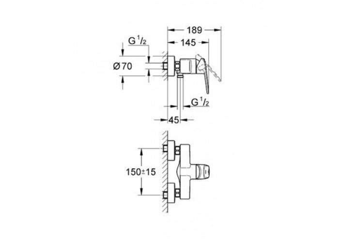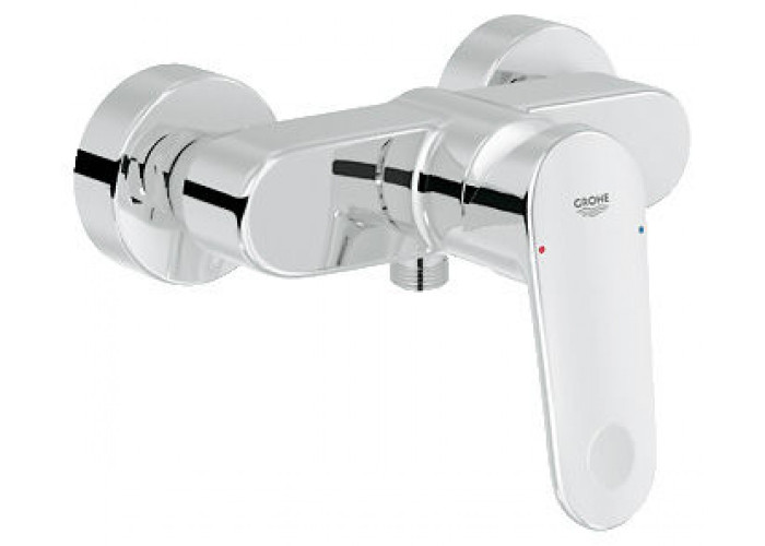 Однорычажный смеситель для душа, настенный монтаж, металлический рычаг, керамический картридж Ø 46 мм, хромированная поверхность, регулировка расхода воды возможность установки мин. расхода 2,5 л/мин., отвод для душа снизу 1/2 со встроенным обратным клапаном, скрытые S-образные эксцентрики, ограничитель температуры с защитой от обратного потока