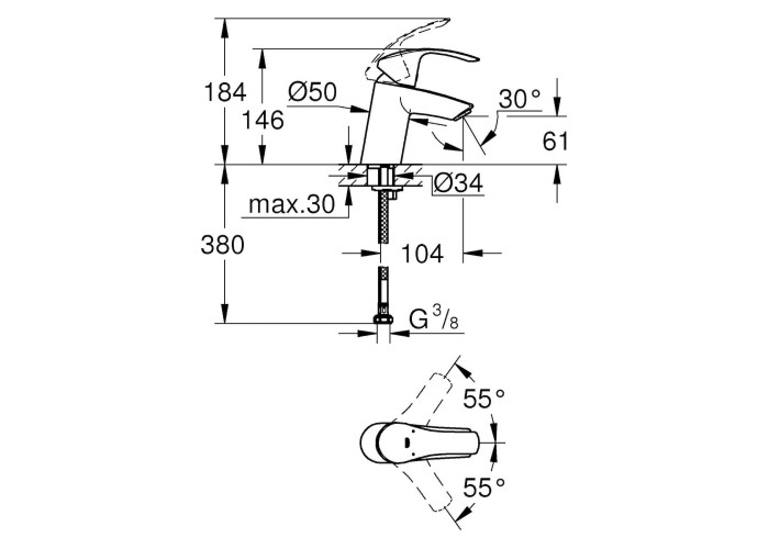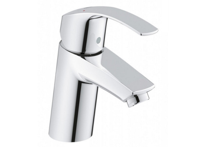 Однорычажный смеситель для раковины, корпус маленький. Без донного клапана, фиксированный излив, керамический картридж, система быстрого монтажа, подводка воды гибкая 350 мм с накидной гайкой 3/8 дюйма, материал - латунь, цвет - хром