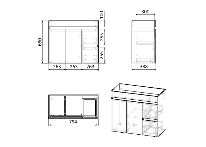 • Одна распашная дверца, два выдвижных ящика, корзина для белья