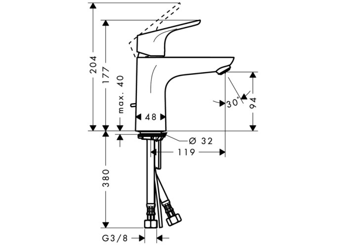 Focus Смеситель для раковины, однорычажныйВыступ 119 mm, обычная струя, расход воды: 5 л/мин, подходит для работы с проточным водонагревателем, ограничитель расхода воды до 5 л/мин, с донным клапаном