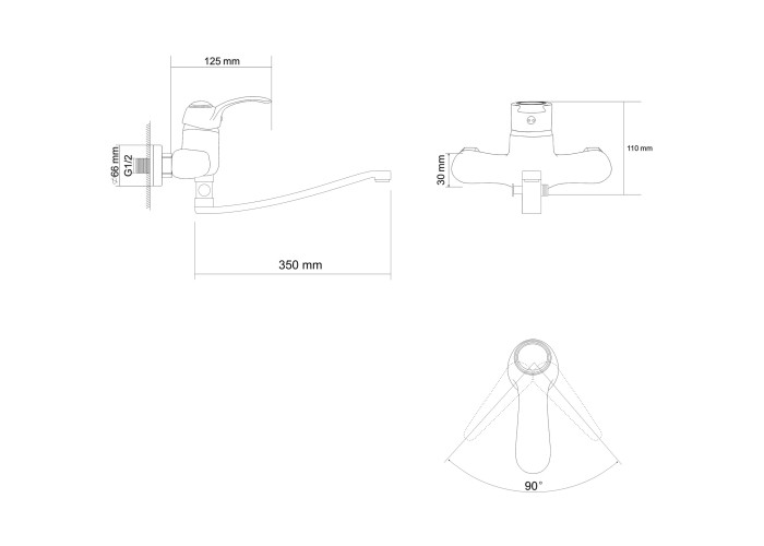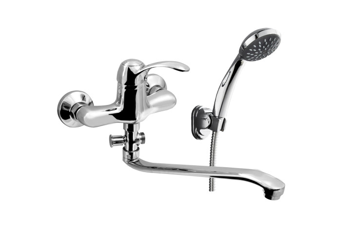 Однорычажный смеситель для ванны, поворотный излив 350 мм, хром, в комплекте: шланг, лейка, держатель